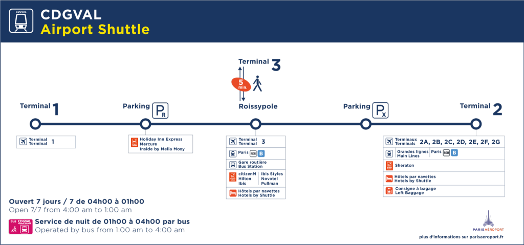 CDG VAL, arrêt « Terminal 3 ». Train automatique et gratuit en face de l’hôtel permettant de rejoindre les terminaux et la gare de train TGV de Charles de Gaulle 2